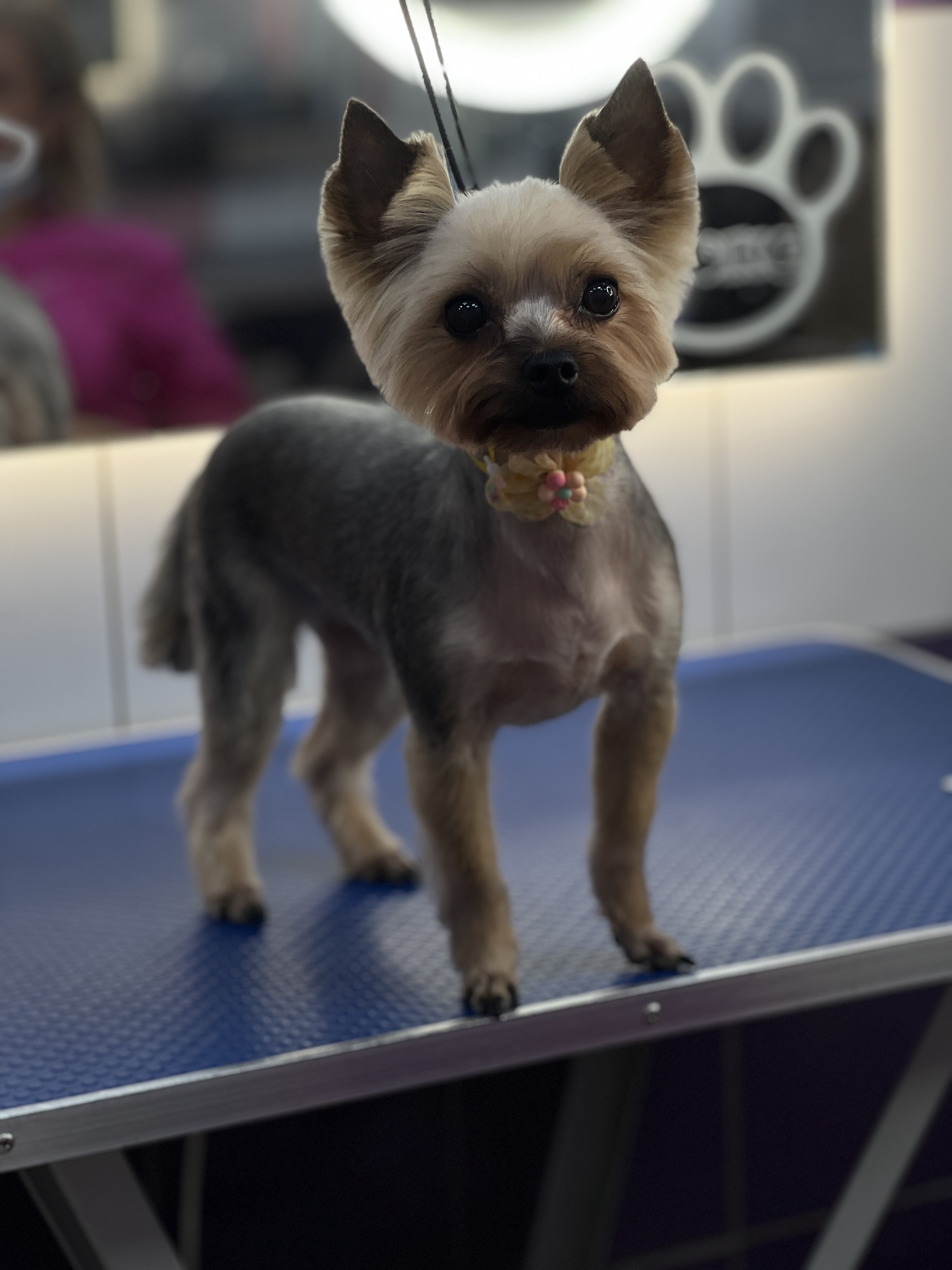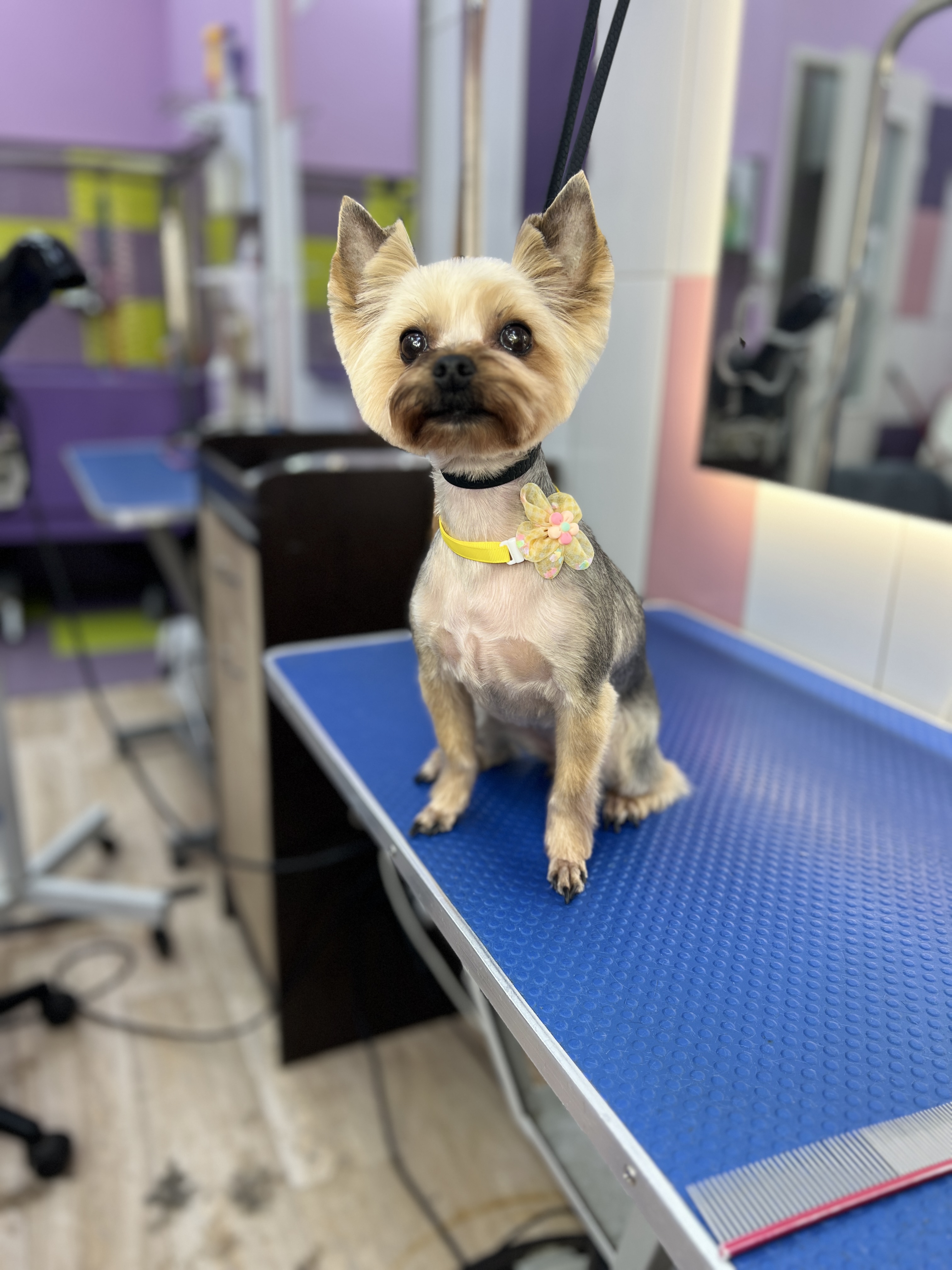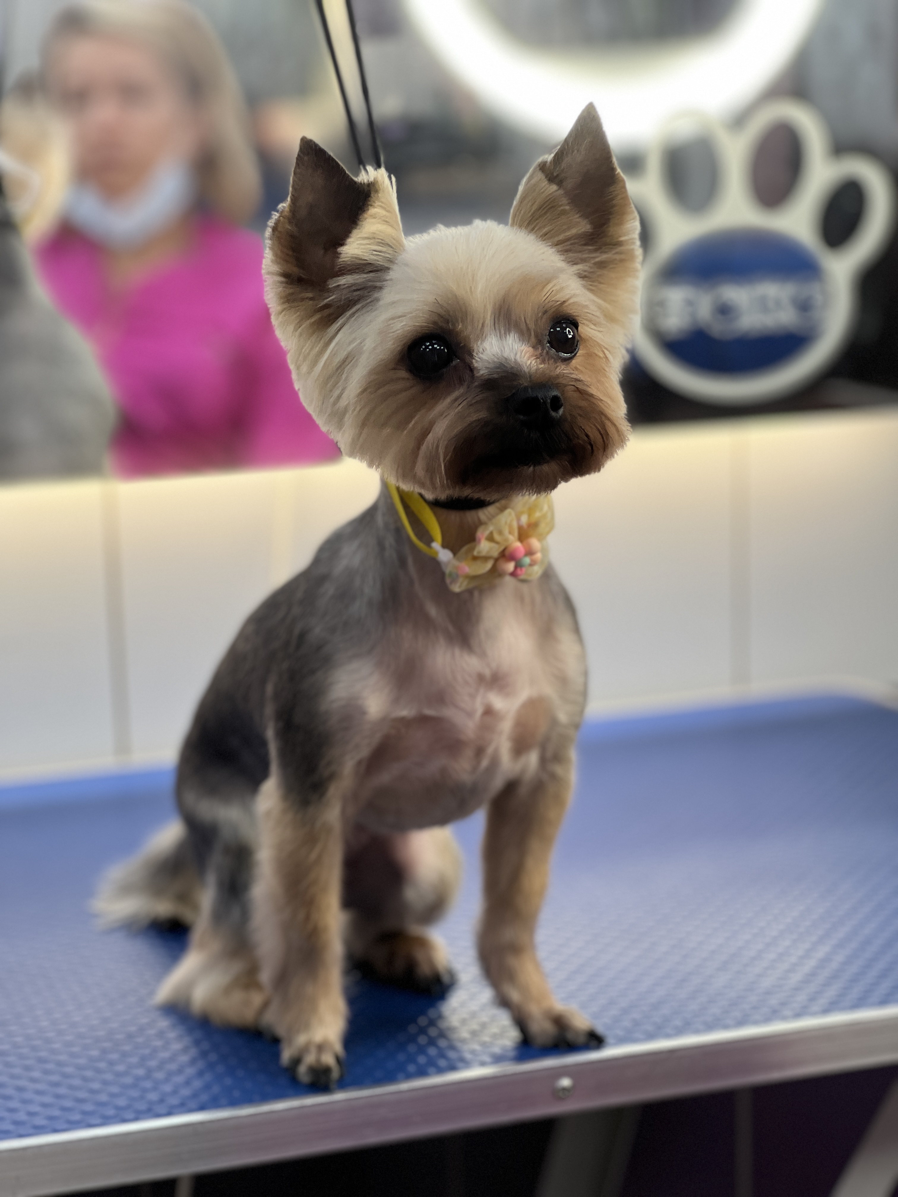 Модельная стрижка йорка включает в себя: подстригание и подтачивание когтей, выщипывание шерсти из ушного прохода, чистка ушей, протирание глаз с использованием лосьона, мытьё собаки с использованием шампуня и кондиционера, сушка (т.е. всю гигиеническую стрижку) и собственно стрижку собаки которую вы выберете вместе с грумером.